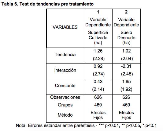El coeficiente de interés para evaluar el impacto es el 1 que resulta en el estimador de diferencias en diferencias. El supuesto de identificación para que el modelo de diferencias en diferencias sea aplicable es que la tendencia del grupo de control sea un estimador insesgado de la tendencia que el grupo tratado hubiera seguido si la intervención no se hubiera realizado. Este supuesto de identificación no puede ser contrastado directamente, pero es posible realizar un test de igualdad de tendencias previas a la intervención. Para realizar este contraste de hipótesis, seguimos lo sugerido por Galiani et al. (2005) y estimamos una variante de la ecuación 4 utilizando solamente los datos de los períodos pre tratamiento (2) y que incluye una tendencia lineal y en lugar de la variable de tratamiento se incluye una variable de interacción entre la tendencia y una variable dummy que asume valor uno si el productor es eventualmente tratado en los períodos posteriores y cero en caso contrario. Si el coeficiente asociado a la variable de interacción no es significativo estadísticamente aporta evidencia a favor del supuesto de tendencias paralelas en el período pre tratamiento. Como se muestra en la Tabla 6, tanto para la variable de resultado superficie cultivada como para suelo desnudo no se rechaza la hipótesis de que las tendencias pre intervención sean idénticas para los eventualmente tratados y los controles, lo que aporta evidencia para sostener el supuesto implícito en las estimaciones por diferencias en diferencias.