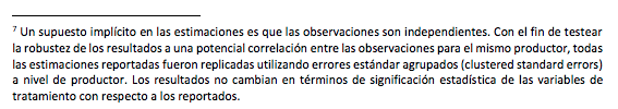 Los resultados de las estimaciones del modelo de diferencias en diferencias se presentan en las columnas 1 y 2 de la Tabla 7. Para contrastar la robustez de los resultados, las columnas 3 y 4 adicionan dos variables de control. Por un lado, el tamaño del predio, que pueden ser heterogéneo entre los productores y además haber cambiado en el tiempo.