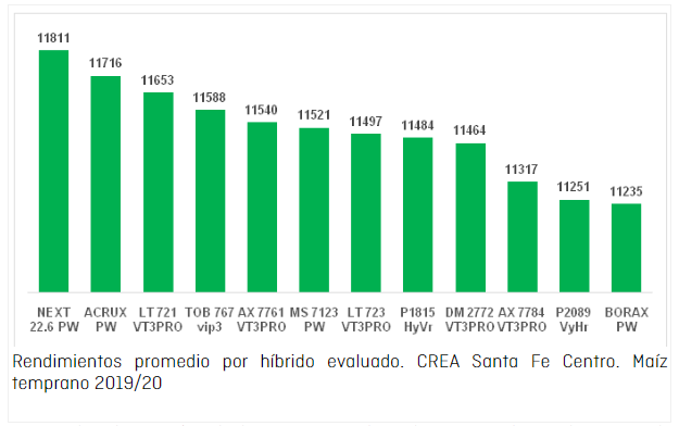 Los híbridos más destacados en el promedio de los cuatro sitios fueron Next 22.6 PW, Acrux PW, LT 721 VT3 Pro, TOB 767 Vip3. AX 7761 VT3 Pro y MS 7123 PW.