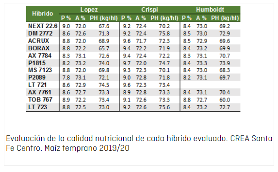 En cuanto a los valores de almidón, el mínimo se ubicó en 71,6% y el máximo en 73.4% con un promedio de 72.7%. Se trata de información significativa para una región productiva que siembra maíz doble propósito: grano comercial y uso forrajero con destino a tambo y/o ganadería de carne.