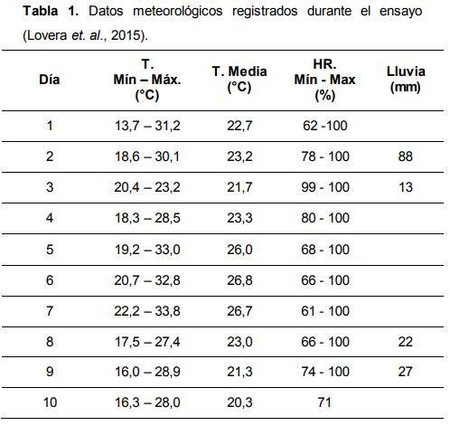El ensayo se realizó en un lote de maíz de la E.E.A. del INTA Manfredi. Se siguió un diseño experimental en bloques completamente aleatorizados con 4 tratamientos y 3 repeticiones. Las parcelas experimentales, de 11 m de ancho por 70 m de largo, se sembraron con el híbrido de maíz Pioneer 1780 HX. Los tratamientos consistieron de la aplicación de tres insecticidas y un testigo sin aplicación. Los principios activos y sus dosis fueron: lufenuron 5% ME (Lucifer, Red Surcos S.A.) a una dosis de 300 cm³/ha, spinetoram 12% SC (Exalt, Dow AgroSciences Argentina S.A.) a una dosis de 80 cm³/ha, clorantraniliprole 20% SC (Coragen, DuPont Argentina S.R.L.) a una dosis de 75 cm³/ha. Los insecticidas se aplicaron, el 2 de febrero de 2015, mediante una máquina pulverizadora de arrastre equipada con pastillas de cono hueco TXA8001VK, a una presión de 3 bares y con un caudal de 90 l/ha. Al momento de la aplicación las plantas presentaban un estado fenológico V6-V7 (Ritchie et al., 1986), y las condiciones de humedad relativa, temperatura y velocidad del viento eran de 93,2%, 18,9 °C y 1,27 m/s, respectivamente. Los datos meteorológicos registrados durante el resto del ensayo se presentan la Tabla 1. En cada unidad experimental, el muestreo consistió de 5 unidades muestrales de 6 plantas consecutivas cada una. En cada planta se registró el daño según la escala visual de Davis (Davis et al., 1992), el número y el tamaño de las larvas de S. frugiperda. Éstas últimas se