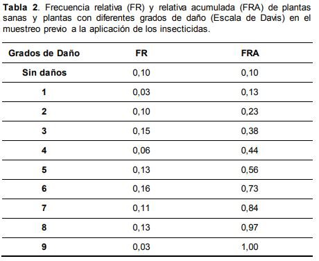En el muestreo previo a la aplicación química el cultivo se encontraba en el estado fenológico V6-V7 y presentaba un 90% de plantas con daño. De estas plantas, 28% presentaba daño leve (Grado 1-3 de la Escala de Davis), 35% daño medio (Grado 4-6 de la Escala de Davis) y 27% daño grave (Grado 7-9 de la Escala de Davis) (Tabla 2). La densidad de larvas por planta varió entre 1,46 y 2,22 (Tabla 3), con 57% de larvas chicas, 36% medianas y 0,7% grandes (Tabla 3). El porcentaje de plantas infestadas inicial varió entre 72% y 87% (Tabla 4). A los dos días de la aplicación de los insecticidas se observó que las parcelas tratadas presentaron densidades de larvas y porcentajes de plantas infectadas significativamente más bajas (p<0,05) a las observadas en el testigo (Tabla 3 y 4). Entre los insecticidas, el spinetoram generó reducciones de larvas significativamente más altas que el