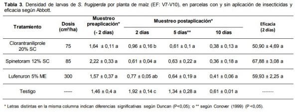Si bien no existieron diferencias significativas de control entre los diferentes insecticidas evaluados, el hecho de que el spinetoram haya presentado una eficacia más alta posiblemente se debe a que tiene mayor acción de volteo con respecto a los otros dos ingredientes activos evaluados. En este sentido, Cruz et al (2010) evaluaron varios insecticidas y señalan que spinosad (mismo grupo químico que spinetoram) provoca una rápida disminución del porcentaje de plantas afectadas por S. frugiperda y presenta una persistencia de 13 días. Por otra parte, en ese mismo trabajo se observa que lufenuron también ofrece un buen nivel de control de la plaga, aunque con una acción más lenta inicialmente, y con una persistencias similar a la del spinosad. Guerreiro et al (2013) señalan que utilizando clorantraniliprole a una dosis de 25 gr. i.a/ha y 300 l/ha de agua registraron una eficacia de 63% de control a los 3 días de aplicado, un valor máximo de 85% a los diez días y de aproximadamente 70% a los 21 días. Además, evaluaron triflumuron, que pertenece al mismo grupo químico del lufenuron, registrando un 70% de control a los 3 días de la aplicación, un máximo de control de aproximadamente 80% a los 15 días y de 60% a los 21 días. Estos mayores valores de eficacia y persistencia con respecto al presente estudio pueden deberse a los mayores caudales y dosis de insecticidas utilizados (clorantraniliprole específicamente), a condiciones meteorológicas más favorables y a tamaño de larvas más pequeñas al momento de la aplicación. Por otra parte, Wangen et al (2015) evaluaron, entre otros insecticidas, la mezcla de clorantraniliprole y lambdacialotrina señalando que este insecticida alcanzó un máximo de 78% de control a los 7 días. Estos investigadores resaltan que ninguno de los insecticidas alcanzó la eficacia mínima recomendada de control del 80%, necesaria para poder considerarlos exitosos y señalan que esto puede deberse a los riegos realizados luego de las aplicaciones.