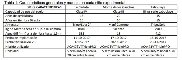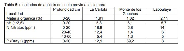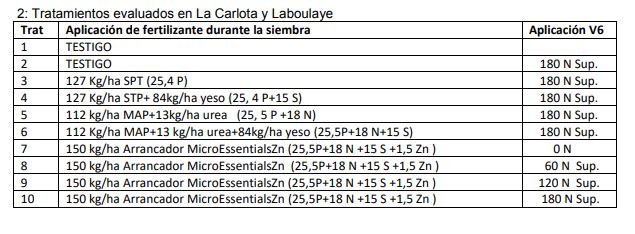 Los sitios experimentales permanecieron libres de malezas durante todo el ciclo utilizando herbicidas de controles totales y residuales para lograr el objetivo. No fue necesario aplicar insecticidas ni fungicidas Las parcelas tuvieron una superficie de 28 m2, (4 surcos a 70 cm. entre hileras por 10 m de largo) dispuestas en un diseño en bloques completos aleatorizados con cuatro repeticiones por tratamiento Previo a la siembra del cultivo se realizó un muestreo de suelo de 0-10 y 0-20 cm de profundidad para realizar un análisis químico de las mismas. Los tratamientos evaluados en La Carlota y Laboulaye se muestran en la tabla 2.