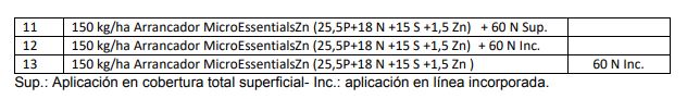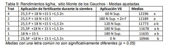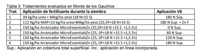 En Monte de los gauchos el ensayo tuvo como objetivo evaluar la respuesta a nitrógeno, a zinc y comparar aplicación del zinc en mezcla química durante la siembra del cultivo con la aplicación foliar de este nutriente en V6. La fuente de zinc foliar utilizada fue Brexil Zn, fertilizante hidrosoluble que contiene 10 % se zinc, a razón de 1,5 kg/ha en forma foliar en sexta hoja. En la tabla 3 se muestran los tratamientos evaluados en esta localidad.
