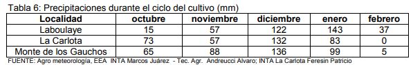 En los tres sitios los valores de materia orgánica fueron bajos. La disponibilidad de nitrógeno considerando los nitraros existentes en el momento de la siembra fue de 88, 20 y 60 Kg/ha hasta los 60 cm de profundidad. Los valores de fósforo fueron bajos en La Carlota y Laboulaye y alto en Monte de los Gauchos. En cuanto al azufre en La Carlota estuvo por encima del nivel considerado crítico y en las otras dos localidades levemente por debajo de ese nivel de 10 ppm de S-SO4. Los valores de Zinc fueron medios en todas las localidades y profundidades analizadas excepto en Monte de los Gauchos donde hasta los 10 cm la disponibilidad fue alta. En la tabla 6 se presentan las precipitaciones durante el ciclo del cultivo.