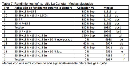 En uno de los sitios evaluados, la aplicación nitrógeno a la siembra, tuvo mejor comportamiento que la aplicación en sexta hoja, posiblemente debido a las napas altas y precipitaciones abundantes durante el llenado de grano.