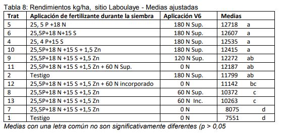 En el momento de implantación del cultivo, había disponible hasta 1,5 m de profundidad 412, 382, y 17 mm de agua útil en Laboulaye, La Carlota y Monte de los Gauchos respectivamente. En Laboulaye y La Carlota antes de llegar al m ya el suelo estaba muy barroso y cerca del 1,5 h se constató la presencia de agua libre indicando presencia de napa cercana. Con los resultados de rendimientos obtenidos se realizó un análisis de varianza utilizando modelos lineales mixtos. En los tres sitios evaluados hubo diferencias entre los tratamientos que se compararon con el test LSD de Fisher al 5% (tablas 7, 8 y 9).