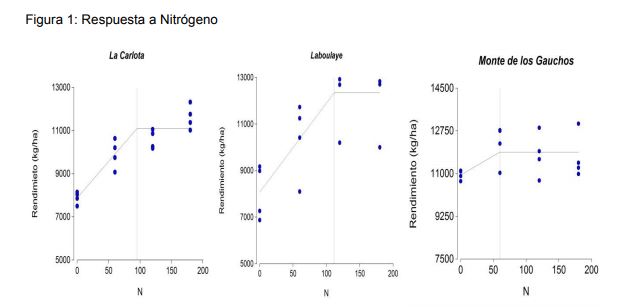 Hubo respuesta a la aplicación de N hasta 60, 95 y 111 kg/ha según sitios evaluados, logrando en cada uno de ellos una cantidad de granos por unidad de N aplicado muy superior a los 5,8 kg necesarios actualmente para pagar un kg de N, lo que hace económicamente recomendable la fertilización con este nutriente.