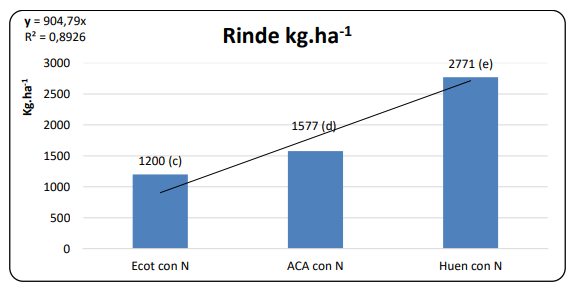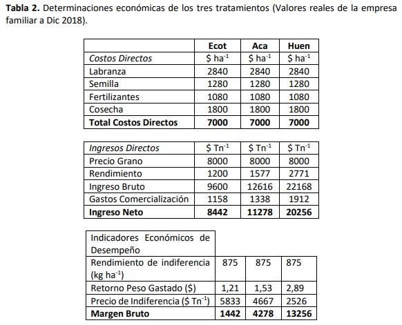 La determinación del resultado económico (Tabla 2) mostró que los márgenes fueron positivos. Sin embargo, la diferencia fue muy amplia a favor de Huen. A pesar de la fertilización, el número final obtenido fue más que interesante, si tenemos en cuenta que el rendimiento indiferencia fue de 875 kg ha-1 . Este es un punto de inflexión ya que los resultados de fertilización son afectados por muchas variables y la probabilidad de obtener resultados varía entre años. Si bien se trata de un cultivo muy versátil, las limitaciones edáficas, climáticas y de manejo en la zona, marcan una fuerte variabilidad en los resultados físicos y económicos.