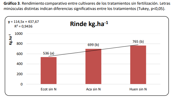 El desarrollo de los cultivares se evaluó desde la fecha de siembra hasta la cosecha. Los datos obtenidos, alcanzaron para determinar los componentes de rendimiento y la estimación de la producción mediante la trilla de los mismos, para los tratamientos fertilizados y sin fertilizar. Así se pudo observar, que el mayor rendimiento fue para los tratamientos fertilizados: cultivar ProINTA Huenpan, seguido de ACA 202 y ecotipo local, con un rendimiento final de 2771, 1577 y 1200 kg ha-1 respectivamente. En el caso de los tratamientos no fertilizados, encontramos que los rindes fueron similares entre si dando 765, 699 y 536 para Huen, Aca y Ecot respectivamente. Gráfico 2. Rendimientocomparativo entre cultivares de los tratamientos con fertilización. Letras minúsculas distintas indican diferencias significativas entre los tratamientos (Tukey, p<0,05).