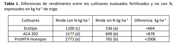 Cuando se analiza las posibilidades del cultivo, debemos tener en cuenta que, la estrategia de fertilización nitrogenada depende de interacciones entre el N edáfico, las precipitaciones (cantidad y distribución), la disponibilidad de agua útil en el suelo y los requerimientos del mismo (Bauer et al., 1992). Sin embargo, en este tipo de suelo, bajo estas condiciones, el agregado exógeno de nitrógeno en forma de Urea, tuvo un resultado netamente positivo. Cuando se evalúa cada varietal, respecto a su testigo, queda en evidencia la respuesta en rendimiento (Tabla 1).