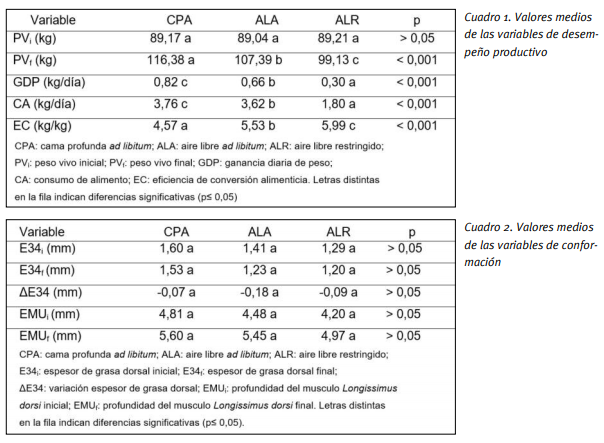 Las diferencias ambientales entre el sistema de túneles de cama profunda y la exposición al aire libre no reflejan diferencias en la deposición de tejido adiposo. La mayor exposición al ambiente de bajas temperaturas (aire libre) afecta en el desempeño productivo del animal mediante la disminución de su crecimiento (GDP) y la merma en la eficiencia de conversión del alimento (EC). La limitación en la oferta de alimento profundiza estos efectos. En condiciones invernales el engorde al aire libre podría ser utilizado localmente como estrategia para evitar un sobrepeso, que implica un menor precio de la media res a faena, aunque en perjuicio de su confort térmico.
