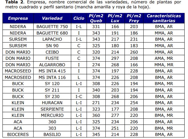 En la campaña 2017 se evaluaron 18 variedades de trigo, de las cuales 11 eran de ciclo largo a intermedio-largo, 5 de ciclo intermedio a intermedio-corto y 3 de ciclo corto. Las mismas se sembraron en macroparcelas de 1200 a 1400 metros cuadrados con la misma tecnología que utiliza el productor. Al momento de la cosecha se procedió a trillarlas con cosechadoras autopropulsadas, pesándose lo obtenido con monotolvas con balanza. El resultado de cada parcela se llevó al equivalente hectárea para evaluar la variable kilogramos por hectárea (kg/ha) corregido al 14% de humedad. En la tabla 2 se presentan la empresa a la que pertenecen las variedades evaluadas, los nombres comerciales de cada variedad, su ciclo, el número de plantas por metro cuadrado (medidas en el estadio de 2 hojas) y sus características de perfil sanitario (tomadas en forma visual en las parcelas de las tres localidades en el estado de hoja bandera -Z39-).