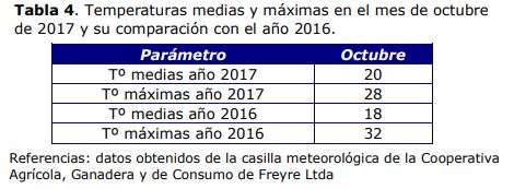 En la tabla 4 se registran las temperaturas medias y máximas del mes de octubre del año 2017 y se las compara con las registradas la campaña anterior (2016), la cual arrojó los menores registros de los últimos 5 años. Se presentan leves diferencias en temperaturas, por lo cual no podemos atribuir a las mismas las mermas de rendimiento respecto de la campaña anterior. La merma en rendimiento podría deberse a que en las tres localidades se sucedieron 2 eventos de bajas temperaturas (heladas), una a mediados de junio y otra a mediados de julio, que afectaron severamente el desarrollo vegetativo de las variedades, principalmente la segunda, puesto que los trigos se encontraban macollando.