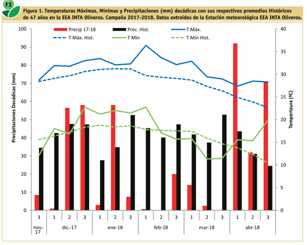 En cuanto a las temperaturas, las máximas fueron elevadas; desde fines de noviembre hasta fines de febrero, en promedio, rondaron los 32.6 ºC coincidiendo con el período de floración y 26º C durante el llenado de los granos. Las máximas temperaturas de esta campaña estuvieron todo el ciclo por encima del promedio histórico de temperatura en un 10%. La misma tendencia se observó en las temperaturas mínimas, estando por debajo del registro histórico desde mediados de febrero a fines de marzo (Figura 1).