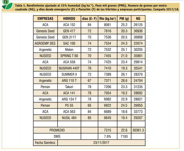 El promedio general de esta campaña fue de 7315 kg ha-1 (Tabla 1), un 11 % inferior a la campaña anterior. Los rendimientos variaron entre 6645 y los 8000 kg ha-1 según el híbrido. Los híbridos SAC 100, NUGRAIN 44T, SUMMER II, SPRING T 60, GEN 417, GEN 311 T, Malón, Arg 110 T, ACA 558 y ACA 152 conformaron un grupo homogéneo, sin diferencias significativas entre ellos, pero superaron al promedio del ensayo en un 3,3 %. Destacándose ACA 152 con 8080 kg ha-1 (Tabla 1)
