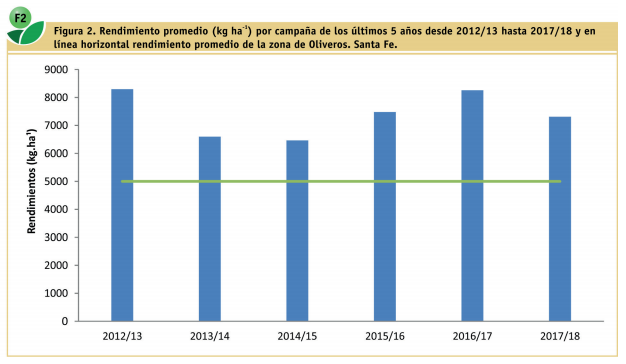 En la Figura 2 se observa que el rendimiento obtenido en estos últimos 5 años supera al promedio de rendimiento para el Departamento Iriondo (Sta. Fe) que es de 5000 kg ha-1 (SAGyP, 2019). El menor valor se registró en la campaña 2014-15 con 6500 kg ha-1, en tanto que el máximo fue en el 2012/13 con 8300 kg ha-1. Esto demuestra que existe una brecha entre el rendimiento del productor (que destina al cultivo a lotes marginales o de baja productividad, con un deficiente control de malezas y de nutrientes) y el rendimiento posible de alcanzar con un manejo adecuado del cultivo, con una variación del 25% al 40 %. Se concluye que esta campaña fue buena ya que los rendimientos obtenidos estuvieron por encima del promedio de la zona.