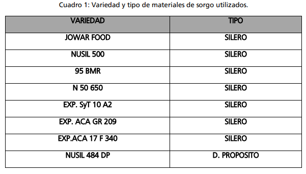 Se evaluaron en total 8 cultivares de sorgo para silo con destino a silaje de planta entera. Se realizó un ensayo con un diseño en bloques completos aleatorizados con tres repeticiones. La unidad experimental estuvo constituida por parcelas de surcos a 0,40 m x 5 m de largo.