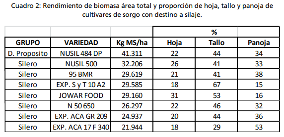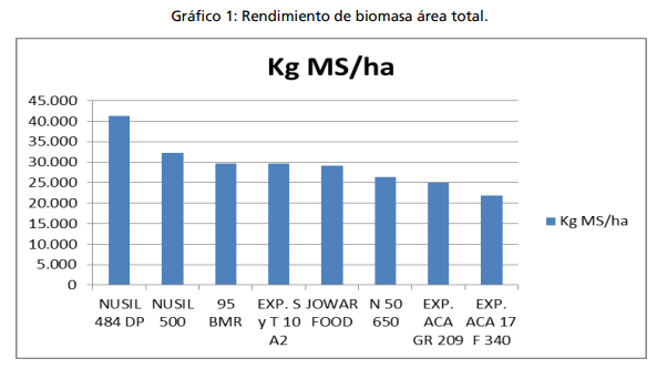 La producción de biomasa aérea total promedio del ensayo fue de 29.382 kg MS/ha y varió entre 41.311 kg MS/ha (NUSIL 484 DP) y 21.944 kg MS/ha (EXP. ACA GR 209).