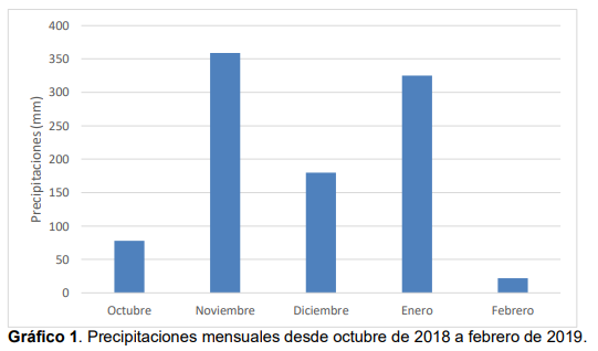 Durante el ciclo de desarrollo del cultivo, desde octubre a febrero, las precipitaciones acumuladas alcanzaron los 964 mm (Gráfico 1), excesivas durante los meses de noviembre y enero.