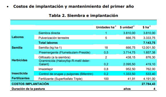 Bajo las consideraciones especificadas en el apartado anterior, a continuación, se muestran los cálculos de costos para la implantación y mantenimiento del cultivo. Para las labores se consideran los costos usuales en la zona de referencia, mientras que para los insumos se toman de referencia los precios corrientes de mercado en pesos.