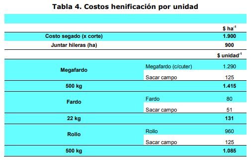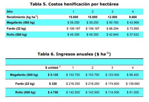 En la Tabla 5 se presentan los resultados de costos finales de henificación por año, mientras que en la Tabla 6 se muestran los ingresos en base a los precios que se obtuvieron del mercado, precios que varían mucho con las cantidades y calidades ofrecidas, la capacidad comercial del productor y la relación oferta/demanda del producto en la zona y otras regiones, que a su vez está directamente afectada por las condiciones climáticas de la campaña y del volumen absorbido para la exportación. Los precios base utilizados fueron para fardos 14,5 $/kg, megafardos 10,25 $/kg y rollos 9,5 $/kg.