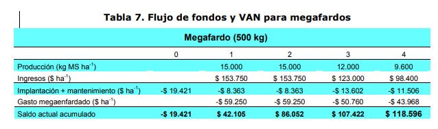 El Valor Actual Neto (VAN 40%) para la opción de megafardos (500 kg) es 118.596 $ ha-1 . En este punto es importante interpretar correctamente este resultado: la cifra de $ 118.596 ha-1 indica la ganancia total que se obtendría del negocio al cabo de los 4 años. Este valor no es un resultado anual. En este caso, el resultado anual ascendería a 29.649 $ ha-1 .