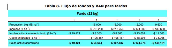 El Valor Actual Neto (VAN, 40%) para la opción de fardos es 148.181 $ ha-1 . Con este resultado se puede afirmar que el resultado anual asciende a 37.045 $ ha-1 .