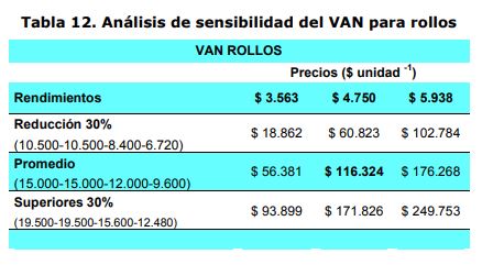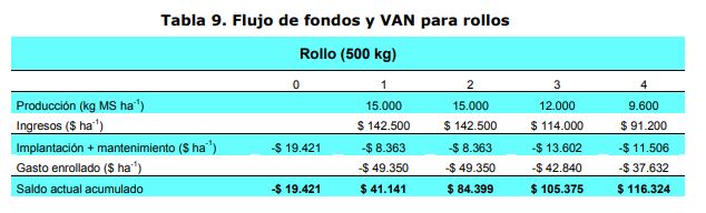 El Valor Actual Neto (VAN, 40%) para la opción de rollos es 116.324 $ ha-1 , con un resultado anual de 29.081 $ ha-1 . Si se comparan las 3 opciones se puede afirmar que el fardo es el que tiene la relación costo-beneficio más acotada, mientras que megafardo y rollo tienen resultados muy similares.