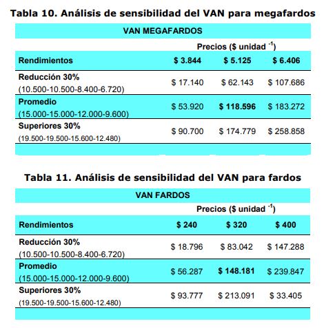 Como pasa en muchos negocios, y muy marcadamente en los relacionados con la producción primaria, hay factores que definen el resultado de las actividades y que no pueden ser controlados por el productor. Entre esos factores, los que más influyen en el resultado económico son el rendimiento y el precio de venta. El primero está influido en gran parte por cuestiones ambientales, tanto climáticas como de suelo, así como de manejo agronómico. En la definición del segundo entra en juego también las variables ambientales al afectar estas a la oferta de heno en el mercado interno, la calidad de producto lograda, el poder de negociación del productor y la cantidad ofrecida, que va a afectar el precio individual al que cada uno podrá vender. Dado que el análisis propuesto en este trabajo, como se dijo al principio, no pretende ser representativo de un sistema específico, sino servir de guía al tomador de la decisión, se presenta a continuación un análisis de sensibilidad del VAN para cada una de las alternativas (megafardos, fardos y rollos), según variaciones combinadas de precios y rendimientos de producto. Concretamente, se proyectan para cada formato de heno, dos situaciones adicionales de rendimiento, una con rendimiento 30% mayor y otra un 30% menor que la media estimada (Tabla 1), calculándose para cada caso el VAN. A su vez se combinan estas situaciones con dos escenarios adicionales de precio promedio de producto comercializado, por un lado, valores 25% arriba y por otro 25% por debajo del actual valor de venta (Tabla 6). Los resultados del análisis de sensibilidad se presentan en las Tablas 10 a 12.