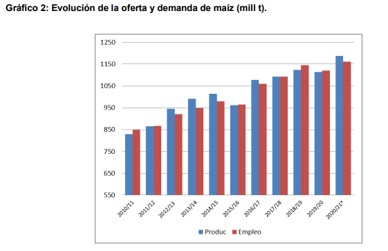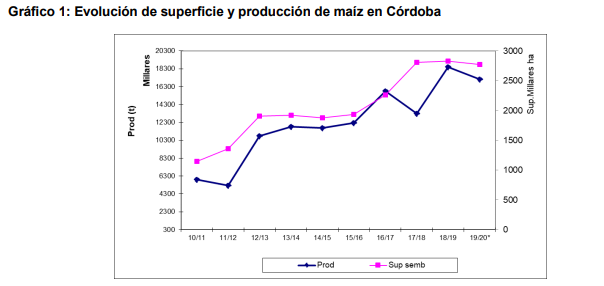 Se observa que, en la última década han mejorado significativamente los indicadores de la oferta a nivel provincial. De esta manera prácticamente se han triplicado los valores de superficie sembrada (pasando de un millón de hectáreas a 2,7 mill ha) y de producción (pasando de 6 millones de toneladas a más de 17 mill t). Esto ha ocurrido en coincidencia con la importante mejora en el precio de la carne bovina y la legislación que favorecía a empleos alternativos del grano (biocombustible).