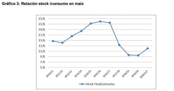 Se muestra que, de las últimas once campañas, solo en tres la demanda ha superado a la oferta mientras que en la mayoría se presenta oferta excedente que incrementa los stocks finales. Esta situación se observa también en la proyección del nuevo ciclo 2020/21 donde la oferta se estima en 1.187 mill t y la demanda global en 1.162 mill t con lo que los stocks finales se incrementan en 34 mill t respecto al ciclo anterior imprimiéndole una perspectiva bajista al precio internacional del maíz (WASDE, 2020) En el gráfico 3 se presenta la evolución de la relación stock final /consumo a nivel global.