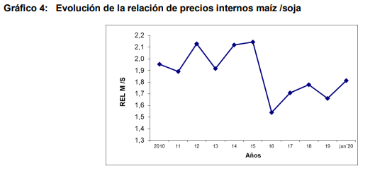 Se observa una suba del índice en la proyección del nuevo ciclo por el exceso de oferta que hace aumentar los stocks, esto produciría una tendencia al mantenimiento de los bajos precios actuales, teniendo en cuenta además la baja de la demanda de bioetanol por la recesión global. Teniendo en cuenta que la superficie sembrada de maíz está ligada a la evolución de la relación de precios con soja, su principal competidor por el uso del suelo, en el gráfico 4 se muestra los cambios en la relación de precios internos entre ambas actividades desde 2010.