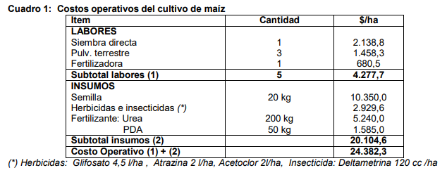 En el cuadro 1 se muestran los costos de implantación y protección del maíz en el sudeste de la provincia en siembra directa con nivel tecnológico medio y considerando el uso de maquinaria propia.