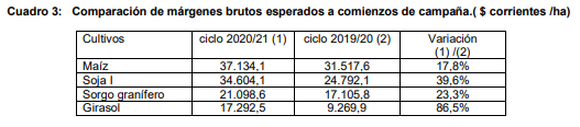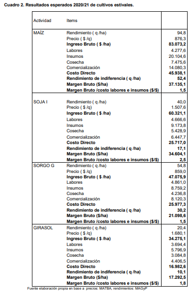 El maíz mantiene el mejor margen entre los cultivos de verano ya que supera en un 7 % al resultado de soja de primera, en un 76 % al de sorgo granífero y en 114 % al de girasol, cabe aclarar que estos dos cultivos se adaptan a zonas más marginales para la agricultura por lo que son opciones no descartables según la zona. Se debe mencionar que, aunque se mantienen estas diferencias a favor de maíz, las mismas tienen menor magnitud que en el ciclo pasado en que el maíz aventajaba por un 27% a soja.