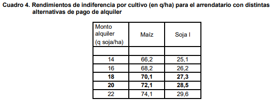 Teniendo en cuenta el índice de inflación ya mencionado surge que solo el girasol presenta resultados esperados positivos en términos reales y la soja mantiene una situación similar a la del ciclo anterior, a su vez, el maíz presenta la mayor baja en su margen real esperado. Considerando la importancia de la producción con la modalidad de alquiler en el cuadro 4 se indican los rendimientos de indiferencia de los principales cultivos de verano que igualan el total de costos (implantación, protección, cosecha y comercialización). En el análisis se agregan a los costos distintos posibles pagos de alquiler en quintales de soja /ha, considerando que se paga el precio actual de mercado en soja, neto de gastos de comercialización.