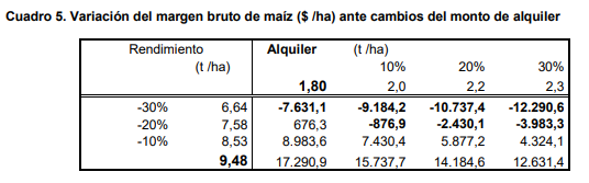 Los rindes de indiferencia, en el promedio de la serie de alquileres representan en maíz el 74% del rinde zonal y han subido un 9% respecto a los valores del ciclo pasado, esto indica una suba del riesgo en el caso del arrendatario para la nueva campaña. A su vez, en soja de primera, el rinde de indiferencia es el 68 % representando un 2% más que el ciclo anterior teniendo un menor riesgo comparativo con el cereal. En el cuadro 5 se analiza la sensibilidad del margen del maíz para el arrendatario ante cambios del monto del alquiler y de rindes.