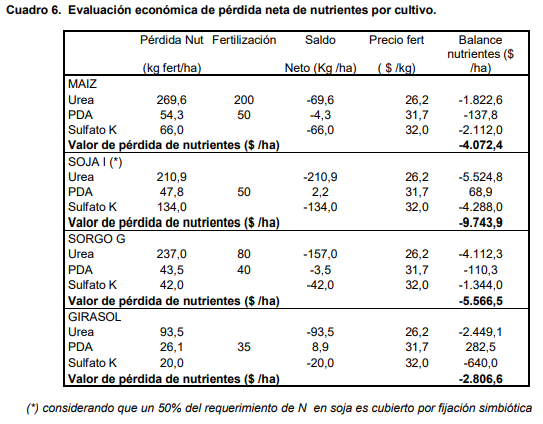 En la situación de precio esperado del maíz (8.763 $/t) y con rendimiento promedio zonal (9,48 t /ha) el arrendatario, pagando 1,8t /ha de soja, obtendría un margen positivo de $ 17.290 /ha que, aunque es positivo y muy similar al del ciclo anterior en moneda corriente, significa que es 37% menor en términos reales por el efecto inflacionario, para el arrendatario. También se observa que, a diferencia del informe anterior, ante bajas del 20% en el rinde promedio se producen resultados negativos si se incrementa el alquiler. La sensibilidad ante variaciones de rindes es mayor a la de modificaciones del alquiler. De este modo, en el promedio de las situaciones la variabilidad del margen ante modificaciones de rindes es 317 %, mientras que ante cambios en el monto de alquiler es 87 %. Considerando el aspecto ambiental en el análisis se calculó el valor de la pérdida de nutrientes. En base a las tablas de pérdida de nutrientes según productividad (IPNI, 2019), los rendimientos medios y las dosis de fertilizantes modales según el nivel tecnológico predominante se calculó el cuadro 6.