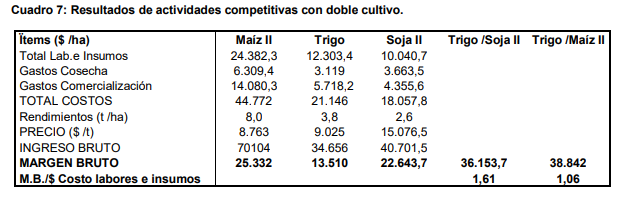 Se muestra la importante pérdida relativa en el cultivo de soja respecto al resto de las actividades mientras que en maíz se compensan parcialmente las extracciones de nutrientes con las dosis medias de fertilizantes aplicados con el manejo modal. En el caso de soja y sorgo deberían aplicarse mayores dosis para balancear los niveles de extracción. Teniendo en cuenta la importancia que adquirió el uso del maíz como cultivo de segunda ocupación luego de trigo, por sus ventajas agronómicas para la conservación del suelo, en el cuadro 7 se muestra los resultados económicos respecto al esquema competitivo tradicional del doble cultivo de trigo con soja de segunda. En el caso del Maíz II se ha considerado un manejo similar al modal y un rendimiento en promedio 15 % menor (Vallone P et al, 2017).