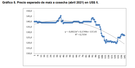 Surge del cuadro un resultado económico levemente superior del uso de maíz II como complementario del trigo en la rotación aunque el doble cultivo tradicional mantiene su eficiencia financiera en el indicador de retorno por peso gastado. Debe destacarse además el efecto agronómico, tanto en el balance de nutrientes como en el consumo de agua y aporte de materia seca que realizan las gramíneas respecto a la rotación del doble cultivo trigo /soja de segunda (Ghida Daza C, Bollatti P, 2016) En el gráfico 5 se muestran las perspectivas de precio esperado para el nuevo ciclo en maíz, para la posición abril 2021 desde que comenzó a cotizar esa posición en noviembre de 2019.