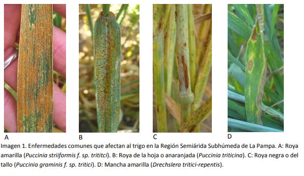En la región Semiárida Subhúmeda Pampeana las enfermedades más importantes desde el punto de vista económico son la Mancha amarilla (MA) causada por el hongo necrotrófico Dreschlera tritici repentis, la Roya de la hoja (RH) Puccinia triticina y la Roya negra o del tallo (RT) causada por Puccinia graminis f. sp tritici, estos dos últimos son patógenos obligados (Imagen 1).