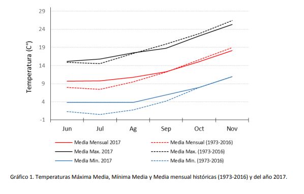 Las condiciones climáticas también aportaron al desarrollo de la epifitia. Se registraron temperaturas mínimas medias y máximas medias superiores a la media histórica en los meses del invierno y levemente menores en los meses de primavera (Belmonte et. al., 2017) Esto se traduce en un invierno más suave y una primavera más fresca (Gráfico 1), resultando en rangos de temperatura óptimas para el desarrollo de la enfermedad que requiere de temperaturas para su desarrollo menores a los 20°C.