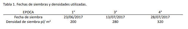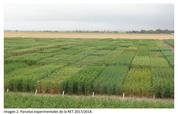 El ensayo de evaluación sanitaria se llevó a cabo en la campaña 2017 sobre la RET 2017 donde se evaluaron 68 cultivares de trigo pan de diferentes ciclos de crecimiento, largos, intermedios y cortos distribuidos en 3 épocas de siembra (Tabla 1). La segunda época de siembra no se realizó.