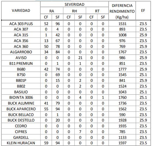 Tabla 3. Severidad de Roya amarilla (RA), Roya de la hoja (RH) y Roya del tallo (RT) y diferencia de rendimiento en los cultivares de trigo pan con (CF) y sin (SF) aplicación de fungicidas para la 3° época de siembra (13/07/2017) de la RET, Anguil 2017-2018.