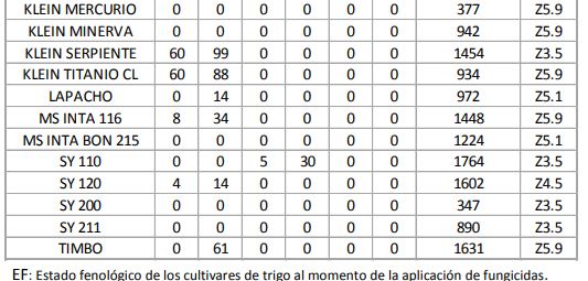 En las tablas 2, 3 y 4 se presentan los datos de severidad para cada roya en las diferentes variedades para cada fecha de siembra. Se presenta además el estado fenológico al momento de la aplicación de fungicida.