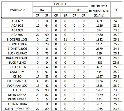La evaluación de enfermedades se realizó el 17 de noviembre y se utilizó la escala de Cobb modificada por Peterson (Stubbs R.W, et al., 1986). Se tomaron 10 macollos de cada repetición en estado de grano pastoso y se evaluó la severidad como porcentaje del área afectada en la hoja bandera (hb) y hoja bandera menos uno (hb-1) para cada cultivar con y sin aplicación de fungicidas. El valor de severidad expresado corresponde al promedio de ambas hojas evaluadas para RH y RA..