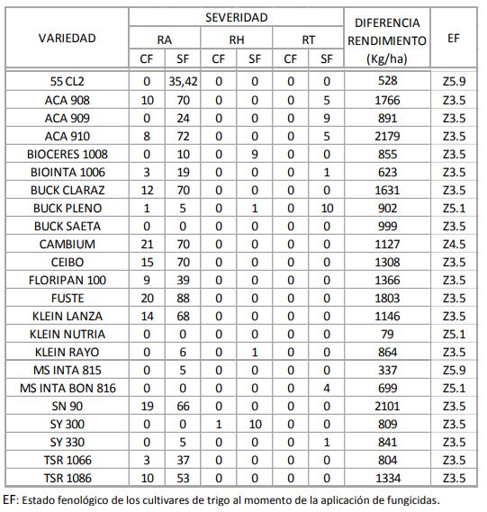 Tabla 2. Severidad de Roya amarilla (RA), Roya de la hoja (RH) y Roya del tallo (RT) y diferencia de rendimiento en los cultivares de trigo pan con (CF) y sin (SF) aplicación de fungicidas para la 1° época de siembra (23/06/2017) de la RET, Anguil 2017-2018