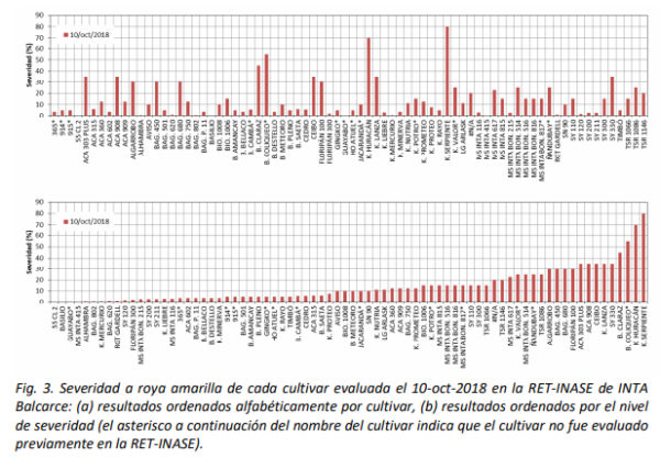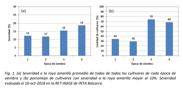 En la última campaña triguera argentina, se produjo el ataque de roya amarilla (o estriada, Puccinia striifrormis f. sp. tritici), más importante desde, al menos el año 1929 (Lindquist, 1982). La epifitia se atribuyó (Campos, 2017) a la difusión de un conjunto de razas denominadas “Warrior” identificadas por primera vez en 2011, en el cultivar inglés homónimo, las que se hicieron predominantes en Europa a partir de 2013. Dado que el grado de susceptibilidad de los cultivares Argentinos a estas nuevas razas no es bien conocido, se presentó un informe (Abbate et al., 2018) con la situación sanitaria de los cultivares evaluados durante la campaña 2017/18 en la RET-INASE de INTA Balcarce. El objetivo del presente informe es presentar los datos de severidad correspondientes a la evaluación temprana durante la campaña 2018/19 en la RET-INASE de INTA Balcarce a fin de facilitar el seguimiento del cultivo y la decisión del control químico de la enfermedad.