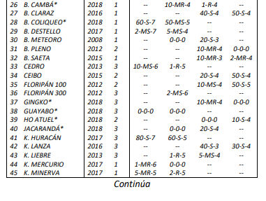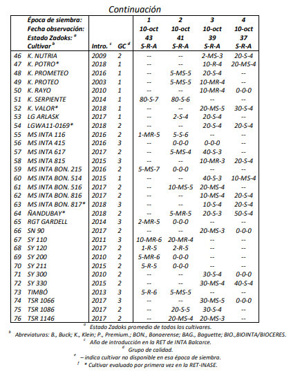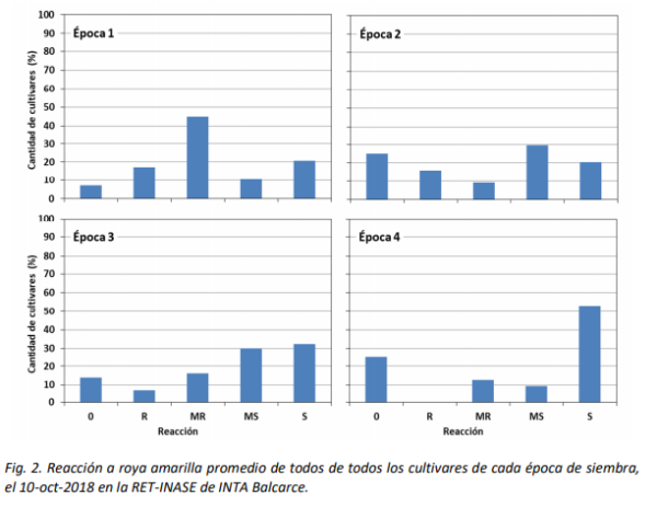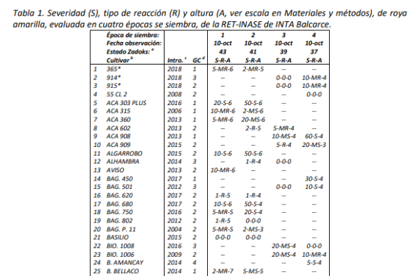 Los datos presentados fueron obtenidos en ensayos conducidos en la Estación Experimental Agropecuaria INTA Balcarce “Ing. Agr. Domingo Pasquale”, Buenos Aires, Argentina (latitud 38° S, longitud 58° O, altitud 130 m), ubicada en la Subregión triguera IV. Estos ensayos forman parte de la “Red de ensayos comparativos de variedades de trigo pan” (RET), coordinada por el Instituto Nacional de Semillas (INASE), dependiente del Ministerio de Producción y Trabajo. Los ensayos considerados se manejaron sin aplicación de fungicidas y sin riego, bajo siembra directa, sobre un suelo Argiudol Típico (USDA Taxonomy), Serie Mar del Plata, con tosca presente a una profundidad promedio de 1 m. El cultivo antecesor fue soja. Los cultivares evaluados se distribuyeron en cuatro épocas de siembra a elección del respectivo criadero. El nivel de ataque de la roya amarilla se evaluó el 10-oct-2018 por medio de la escala Cobb modificada (Roelfs et al., 1992), registrando el porcentaje de severidad (0 a 100) y el tipo de pústula (uredias) como: 0 (nula, sin infección visible), R (resistente, áreas necróticas con o sin pústulas pequeñas), MR (moderadamente resistente, presencia de pústulas pequeñas rodeadas por áreas necróticas o cloróticas), MS (moderadamente susceptible, presencia de pústulas de tamaño mediano sin necrosis posiblemente rodeadas de clorosis), S (susceptible, presencia de pústulas grandes, sin necrosis y poca o ninguna clorosis). La severidad y reacción se evaluaron en el horizonte de hojas con mayor severidad. Adicionalmente, se registró la altura hasta la donde la enfermedad alcanzó una severidad mayor a 5%, expresada como altura desde el suelo, donde 8 correspondió a la hoja bandera expandida, 7 a la anteúltima hoja expandida y 6 a la antepenúltima hoja expandida.